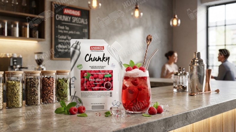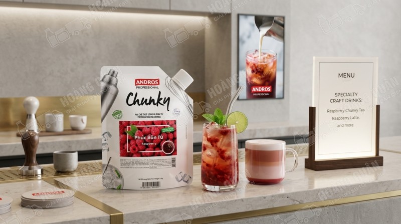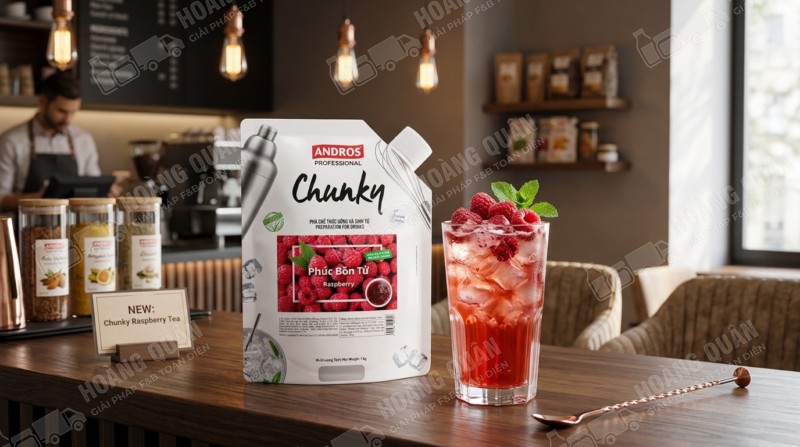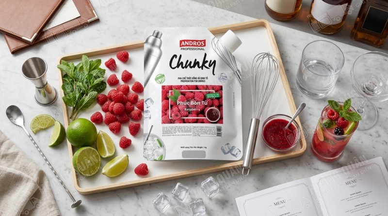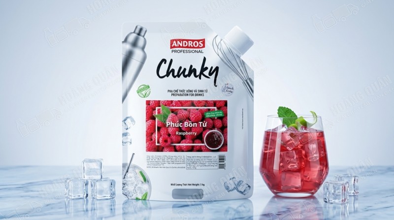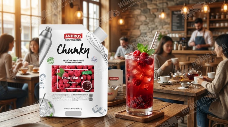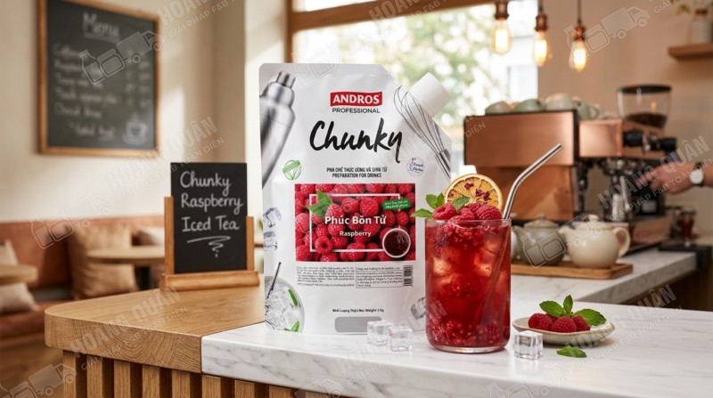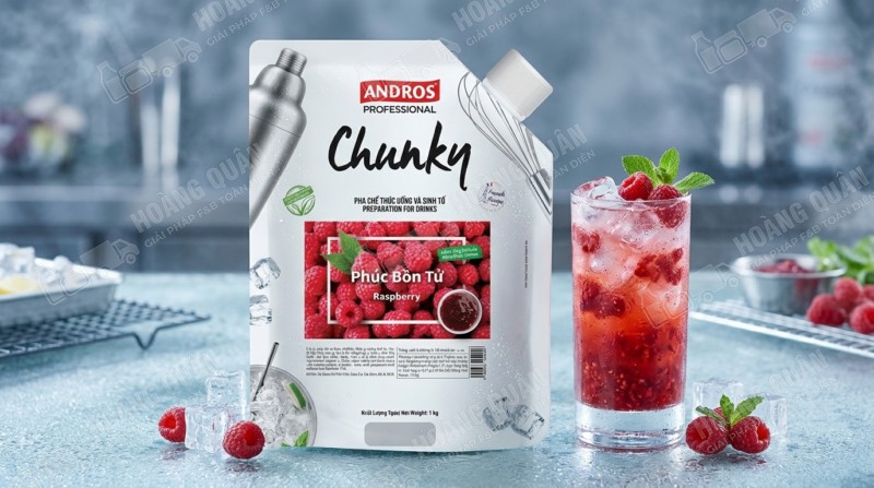 Chunky Andros – Mứt phúc bồn tử 1kg là nguyên liệu pha chế cao cấp giúp quán F&B tạo ra những món đồ uống mang phong cách berry hiện đại, đẹp mắt và dễ viral. Với hương vị chua ngọt tự nhiên, màu sắc ruby sang trọng và tính ứng dụng cao, sản phẩm là lựa chọn lý tưởng để nâng tầm menu và tăng doanh thu.